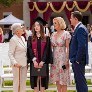 The graduation ceremony stretched across the manicured lawn like a postcard of American triumph—burgundy and gold banners, folding chairs squared into neat ranks,…