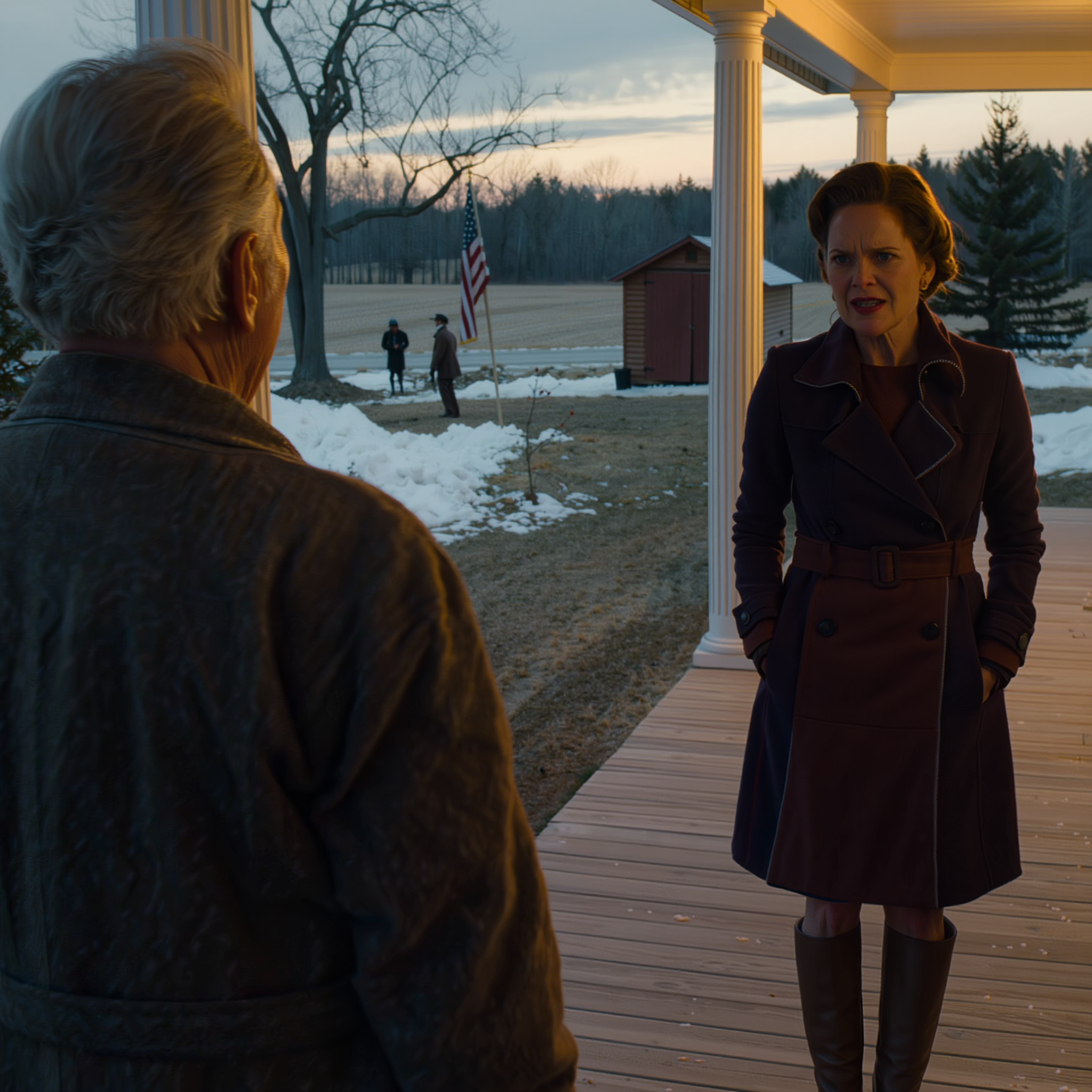 By the time I turned onto County Road 7, the first flakes had started coming down—small, dry, impatient. The farm looked the way it always looked in the hour before dark: barn roof turning silver, porch light casting a yellow patch on the steps, chimney smoke flattening in the wind. Ordinarily that sight settled me. That evening it felt like coming home to something that had already shifted half an inch off center.