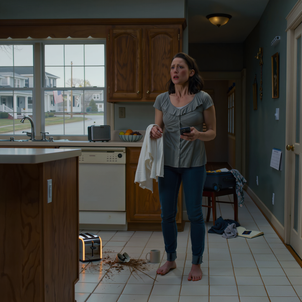 I stood in the middle of the kitchen, breathing in short, fractured bursts, staring at the place where my breakfast had become a crime scene.