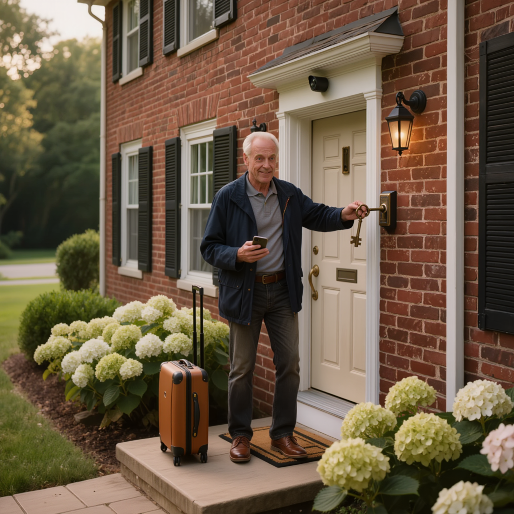 Tonight the porch light is on. The shutters are back to Margaret’s gray. The ugly ceramic bowl disappeared months ago. The camera above the front door is mine now, properly installed, properly configured, visible without apology. The brass key sits warm in my palm when I come home from the grocery store or the hardware store or Owen’s game. Sometimes I pause before I slide it into the lock.