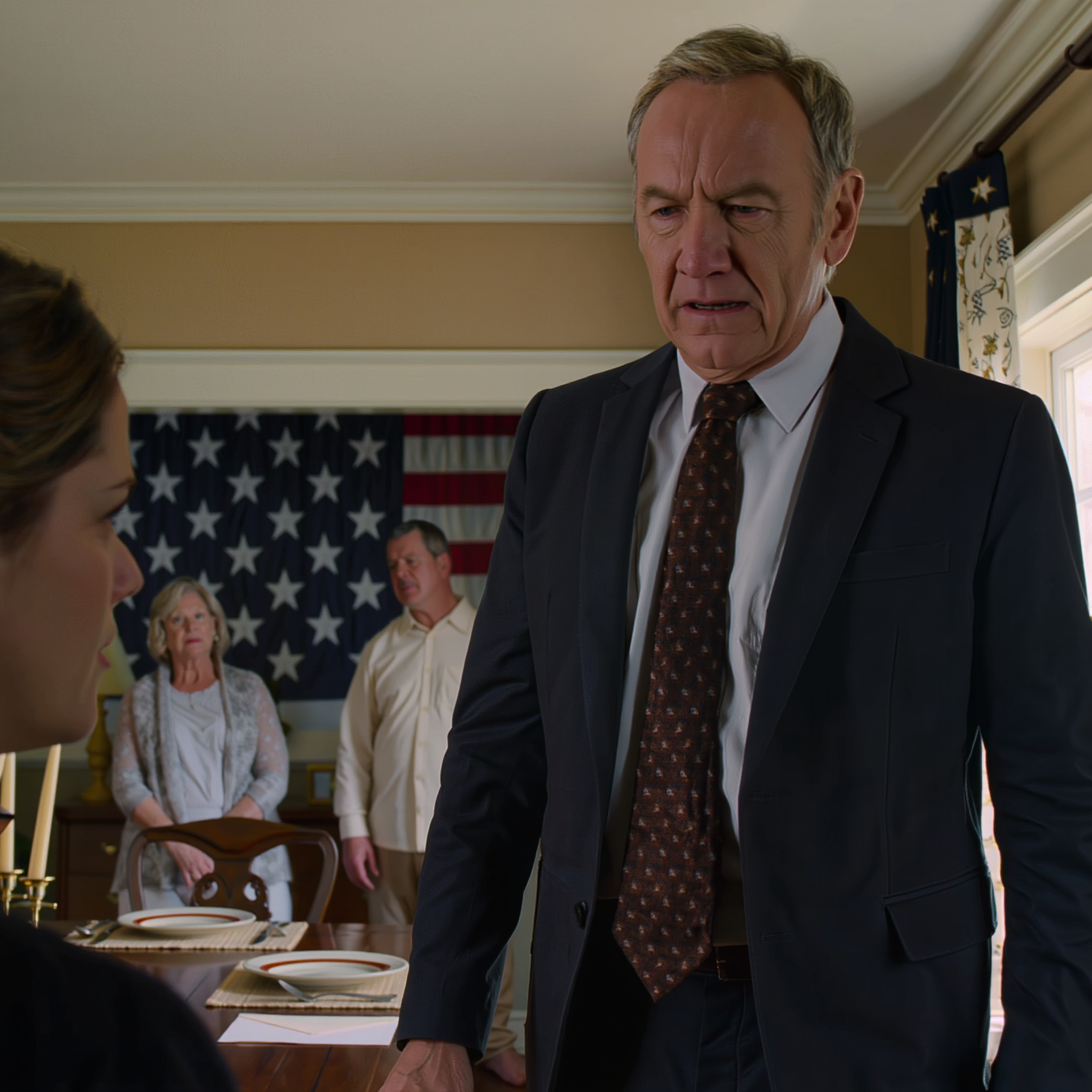 The envelope trembled between her small fingers. My father’s hand lifted, then stalled in midair. Around us, the room went so quiet I could hear the wall clock above the china cabinet ticking over the buffet, steady and merciless.