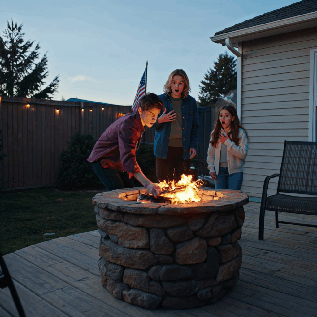 I didn’t hear the laptop hit the coals—only the soft roar of flame taking its first breath of new air, the hungry way fire makes everything sound like the beginning of a confession. The cedar logs had been cracking all evening in my parents’ stone fire pit, tossing sparks up into a sky the color of wet slate. When the box’s edges curled inward and the lid sagged like a closing eye, the heat flared white. My daughter’s breath caught beside me.