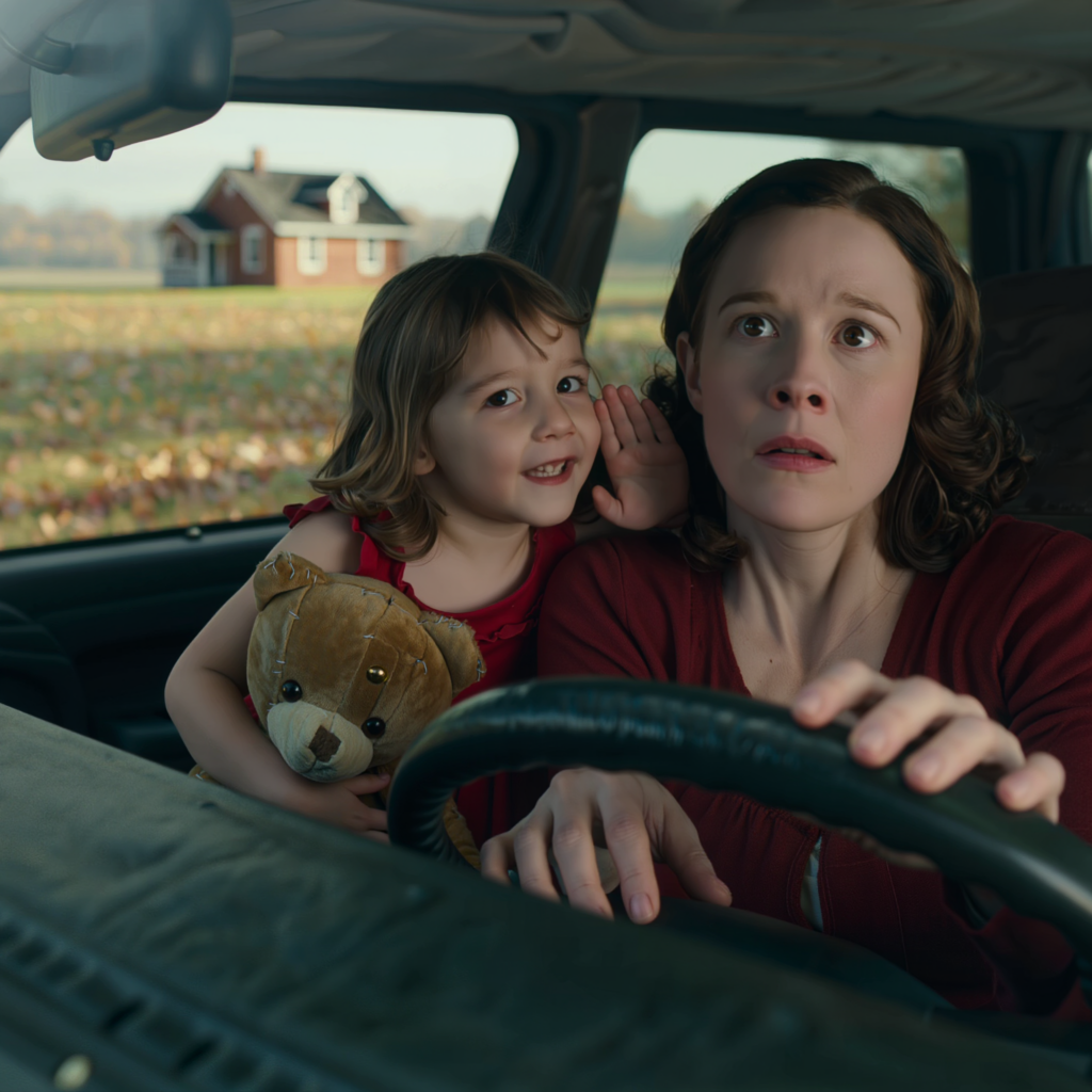 Every other time I pulled into Eleanor Whitaker’s gravel driveway, my daughter came flying off that farmhouse porch in a blur of brown curls, crooked socks, and joy, Marbles the teddy bear bouncing under one arm like a second child I was somehow also responsible for. That morning she stepped out slowly, holding Marbles by the middle so tightly the little red picnic dress bunched in her fist.