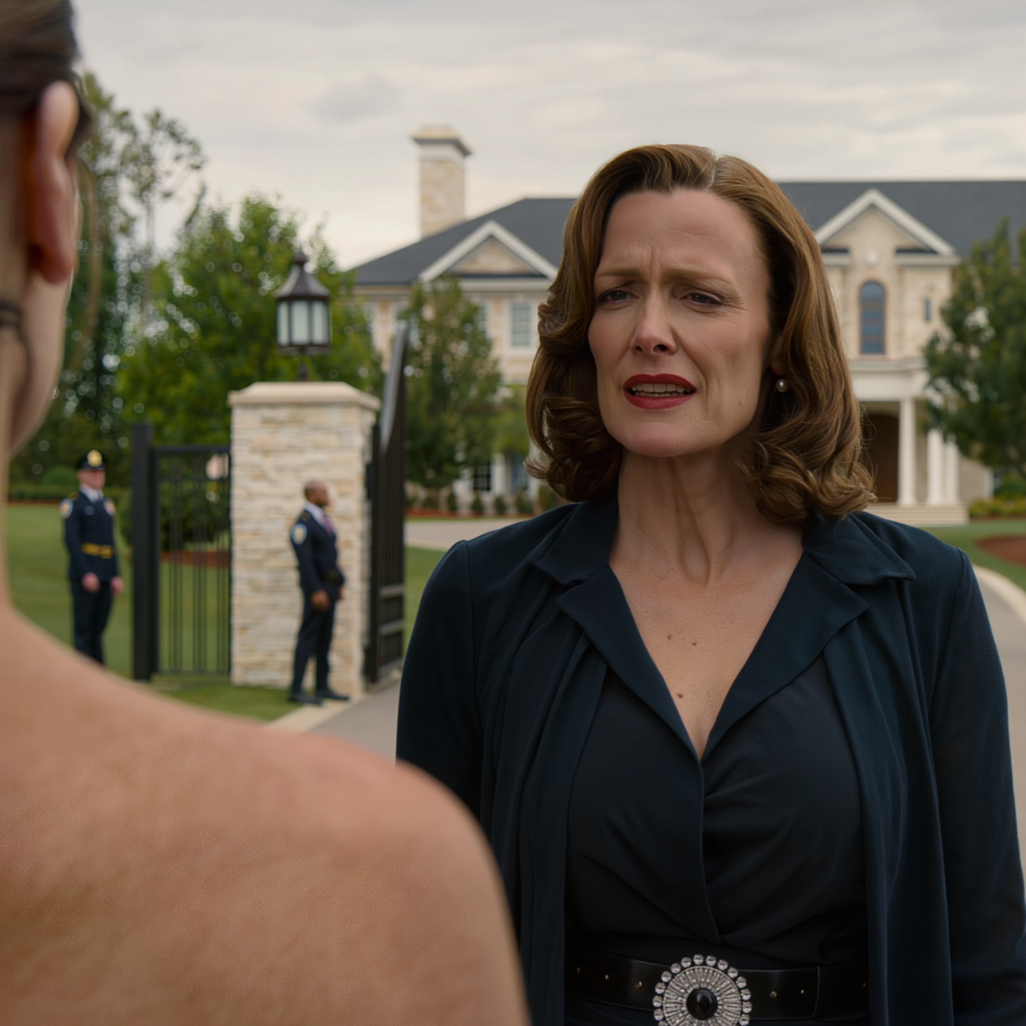 I looked up from the quarterly numbers on my desk and toward the security monitor mounted beside a wall of books I had bought mostly because eighteen-year-old me would have thought that kind of sentence belonged to somebody else’s life. On the screen, my mother stood in a cream blazer that had once looked expensive and now looked tired. One hand was pressed to her chest. The other stabbed at the intercom as if the gate had personally insulted her. My father hovered behind her near a gray rental SUV, shoulders rounded, eyes on the gravel, already practicing surrender.