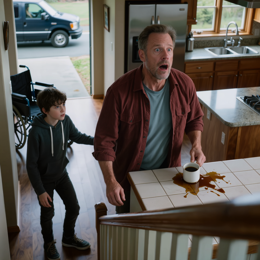 Coffee spread across the kitchen tile in a hot brown fan, the ceramic handle skidding toward the pantry baseboard, but I barely noticed any of it because my son was standing at the bottom of our staircase.