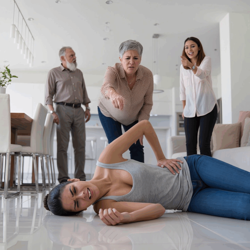 I heard the crack before I felt it—a bright, brittle snap like a winter twig under a boot. The corner of the dining table found the soft place beneath my ribs and the room went white around the edges, the way light looks when you stand too quickly. My sister’s breath washed over me, warm with wine and peach shampoo. She was still yelling about a shirt, a nothing, a small thread she’d pulled until the whole fabric gave way. I tried to breathe the way I always had—thoughtlessly—and air turned into a narrow doorway that kept closing.