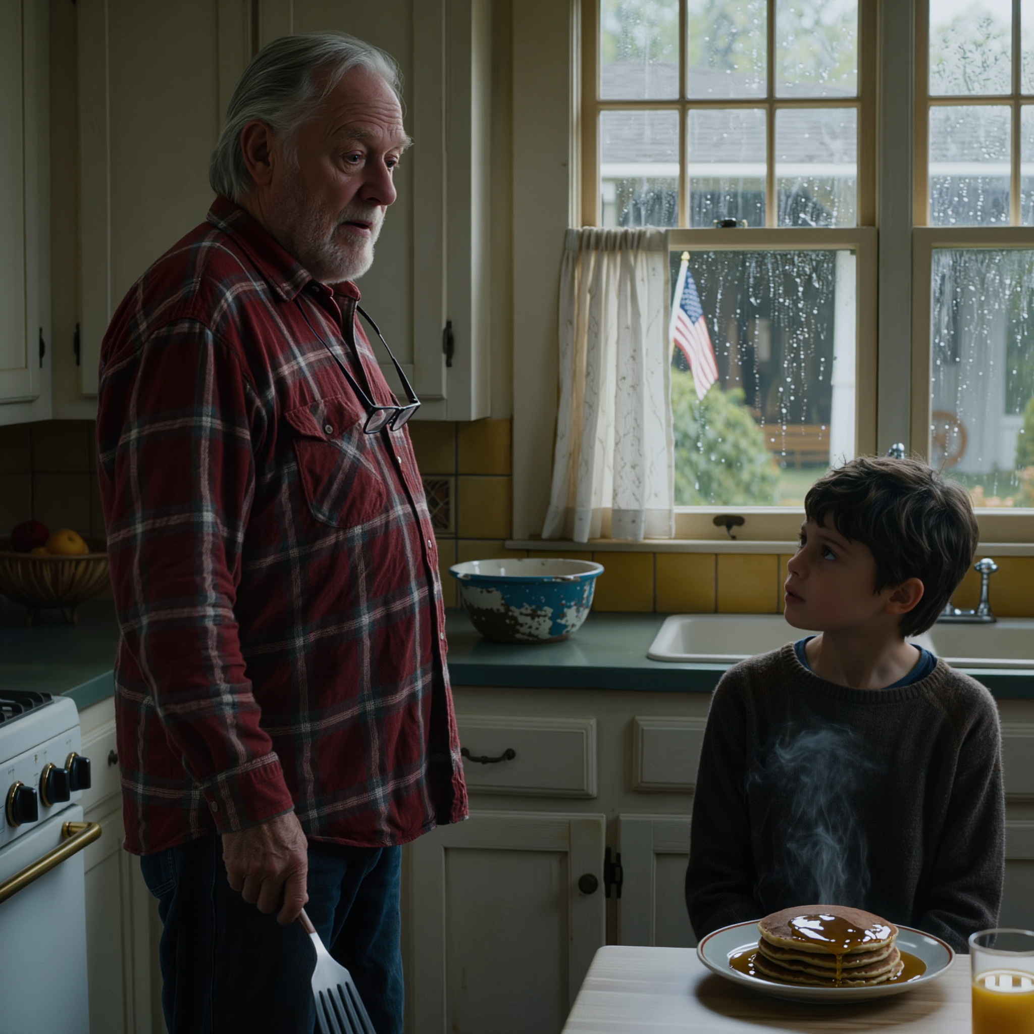 I set the plate in front of him the way I had done a thousand times for kids who visited my house when mine were young—three pancakes, butter melting down the sides, syrup in a generous amber pool, a fork placed on the right because some habits outlast the people who taught them.