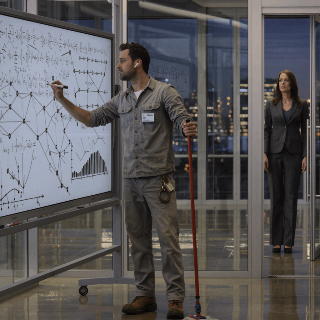 Out in the corridor a faded gray uniform moved past an overfilled bin. Daniel Hayes bent to scoop up a rolling soda can, nudged it into the trash with a practiced flick, then straightened and kept walking. One earbud dangled from his left ear, the other in place. The night‑shift janitor look didn’t come with much theater: worn shoes, a ring of keys, a cart that squeaked on one wheel. But when he passed the glass wall of the boardroom his eyes caught on the whiteboard inside.