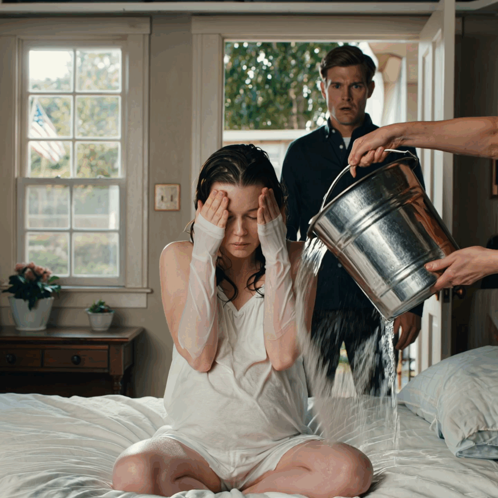 It was a bright, hard cold—metallic, almost chemical in the way it erased every layer of warmth she had hoarded from a four-hour sleep. It hit her collarbone first and then ran in a sheet across her chest, underneath the thin cotton of her pajama top, under the ribs, into the curve of her belly and down to the waistband where it pooled, indecently intimate. The shock ravaged thought. Sound arrived after: the scrape of a bucket lip against the nightstand, the small glass clatter of an alarm clock nudged aside, the voice.